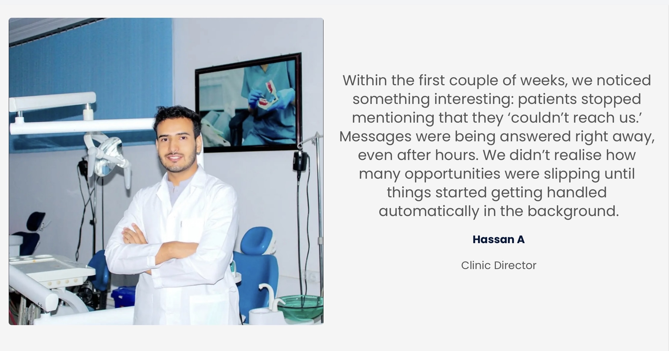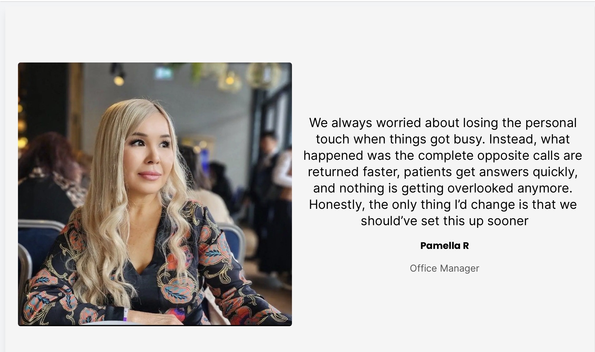 Our AI dental receptionist instantly responds to missed callers through text or voice with empathetic, human-like messages that feel genuine and book appointments 24/7. Unlike traditional virtual receptionists, our dental AI never sleeps. Always On. Always Caring
