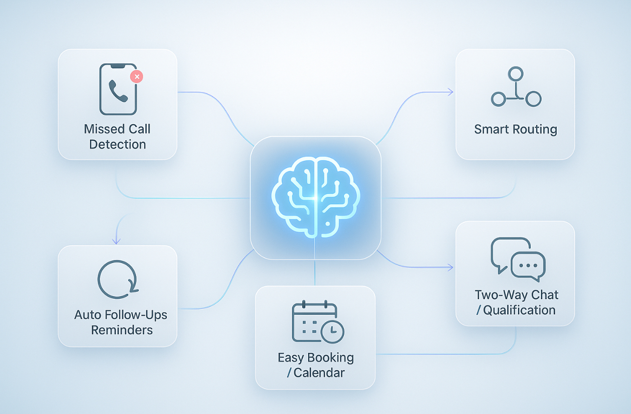 When a call is missed, the caller instantly receives a friendly text from your business number. The AI asks a few simple questions, captures their details, and offers available times pulled from your calendar or booking system. Your team sees every conversation, can step in at any time, and gets a clear list of new bookings and leads each day.