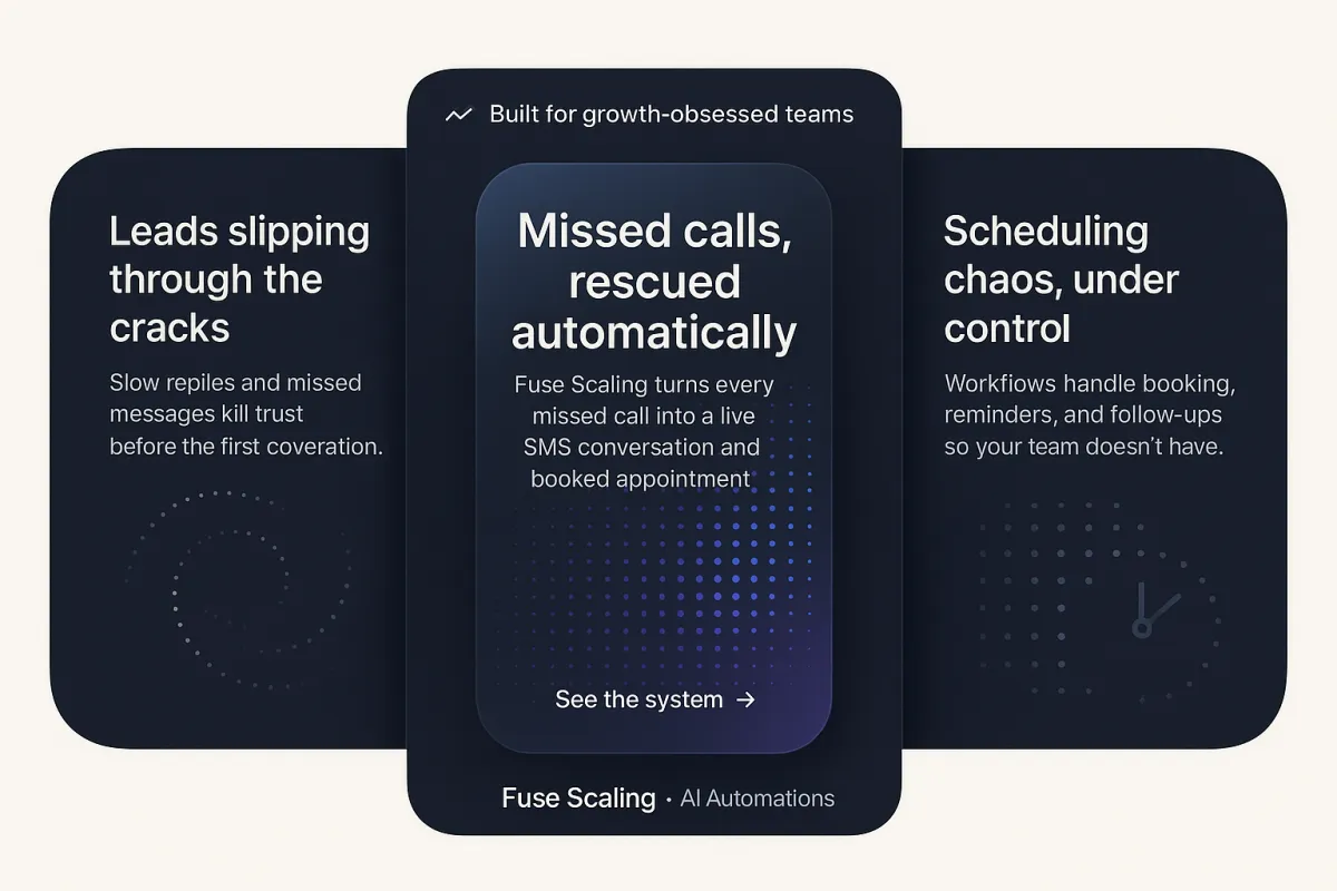 Fuse Scaling builds an AI‑powered missed‑call and intake system for your business. When someone calls and no one can pick up, our system starts a text conversation, answers common questions, and moves them toward a booked appointment or job. We also automate reminders and follow‑ups so more people actually show up.